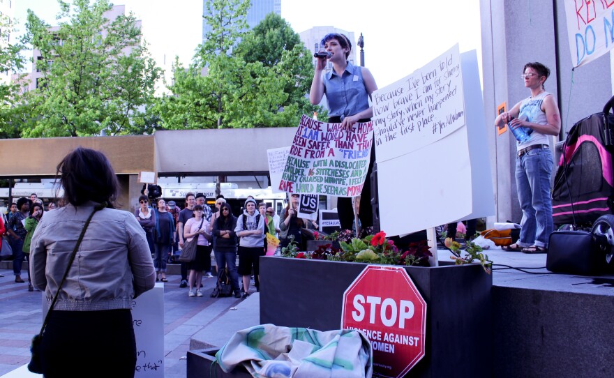 From the Internet came the rally, which was advertised on posters around the city and promised a six-second scream. Women could also tell their stories of being hurt to those gathered at Westlake Park in downtown Seattle.