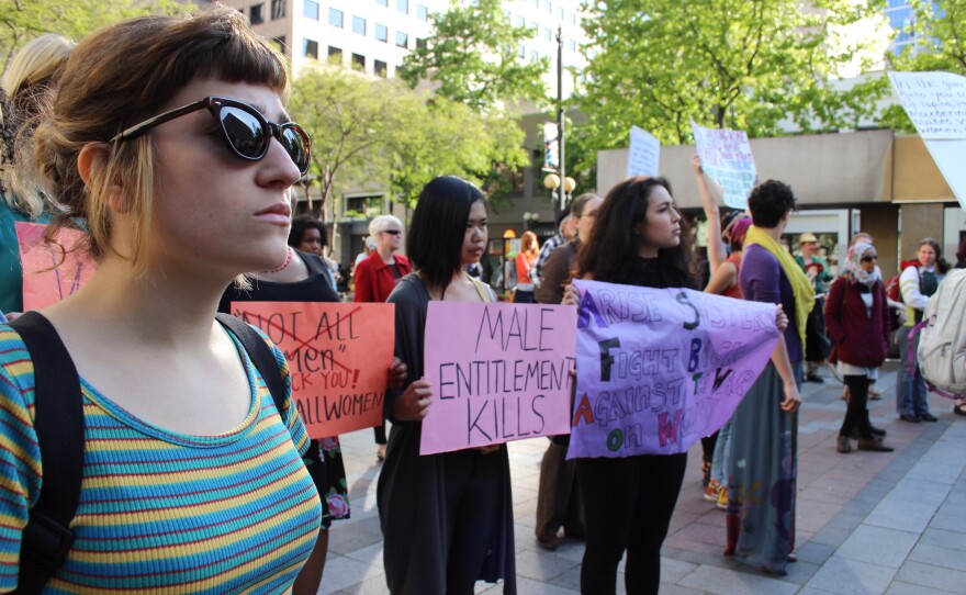 On Friday evening, Kuffel, 20, stood toward the back of a rally that had been hastily organized in response to the shootings at University of Santa Barbara the week before. A 22-year-old man had gone on a rampage, killing seven, including himself. His 140-page misogynist manifesto, found later, spurred an online movement, #YesAllWomen.
