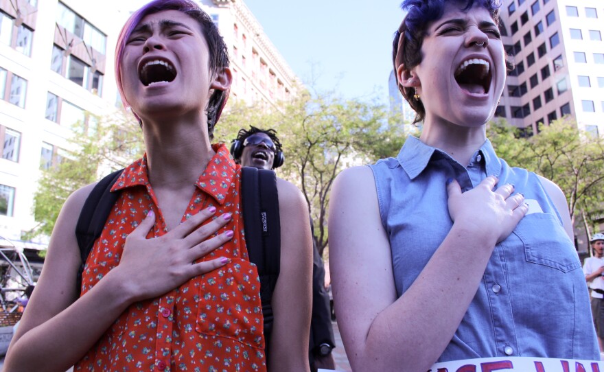 When it came time to scream, Kuffel and DeSouza put their hands on their hearts. And when they screamed, with some 300 other women and men, it didn’t sound angry or scared. It sounded joyous — and a little like singing.