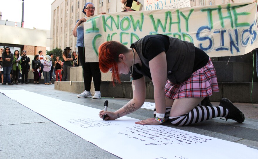 She carried a homemade sign that explained why: "Because walking home at 1 a.m. would have been safer than that ride from a 'friend.' Because with a dislocated shoulder, 16 stitches and a nearly collapsed windpipe, I felt my rape would be seen as my fault."
