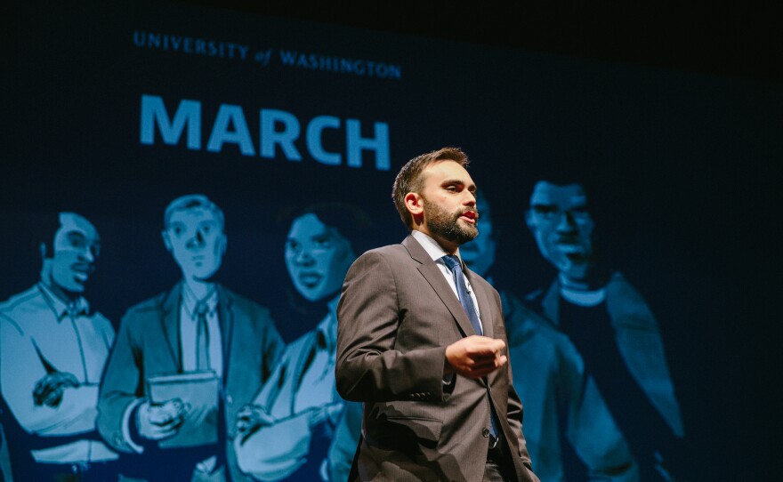 Lewis spoke at the University of Washington’s Meany Hall on February 23. He was joined on the stage by UW President Ana Mari Cauce, UW Vice President for Minority Affairs Rickey Hall, moderator Craig Sims and musicians Courtney Jones and Nathan Nanfelt.