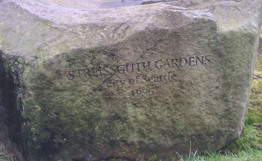 One of the stairways Cathy and Jake walk with me (and feature in their book "Seattle Stairway Walks") is the Blaine Street stairs located at 10th Avenue East and Blaine Street in Capitol Hill. On the south side of the stairs is a secret garden of sorts. Streissguth Gardens have been open to the public since 1996, when architect Dan Streissguth and his wife bought the land on the south side of the Blaine Street stairs. They transformed it from an overgrown, brambly mess to manicured flower gardens. Streissguth Gardens are open to the public, and quite often Dan Streissguth is in the garden. He and his wife live right on the other side of the stairway, and Cathy and Jake have a standing invitation to stop by the Streissguth home whenever they’re walking the Blaine Street stairs.