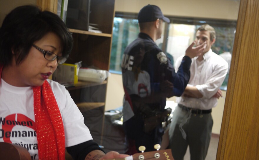 The women sang and shared personal stories about loved ones who have been deported and the struggles here for undocumented workers. As they did, Caleb Heimlich, executive director of the state GOP, stepped out of his office with a smile.