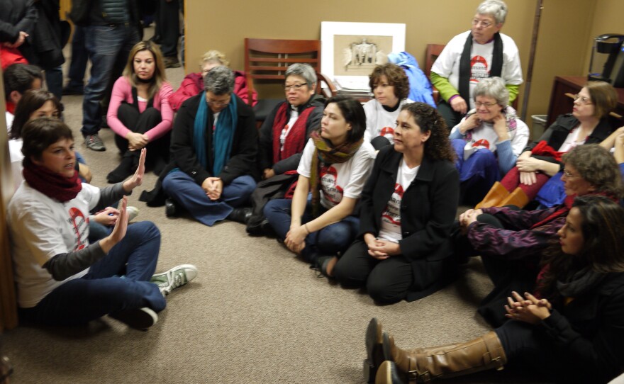 The women – including Peggy Lynch, the wife of outgoing Seattle Mayor Mike McGinn – sat in the lobby with their arms linked and their message clear: They wanted their representatives to take action on immigration reform. Outside, another 150 people rallied in support.